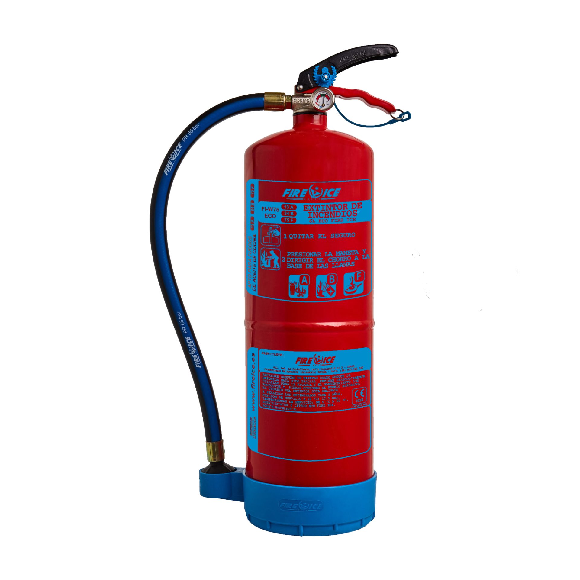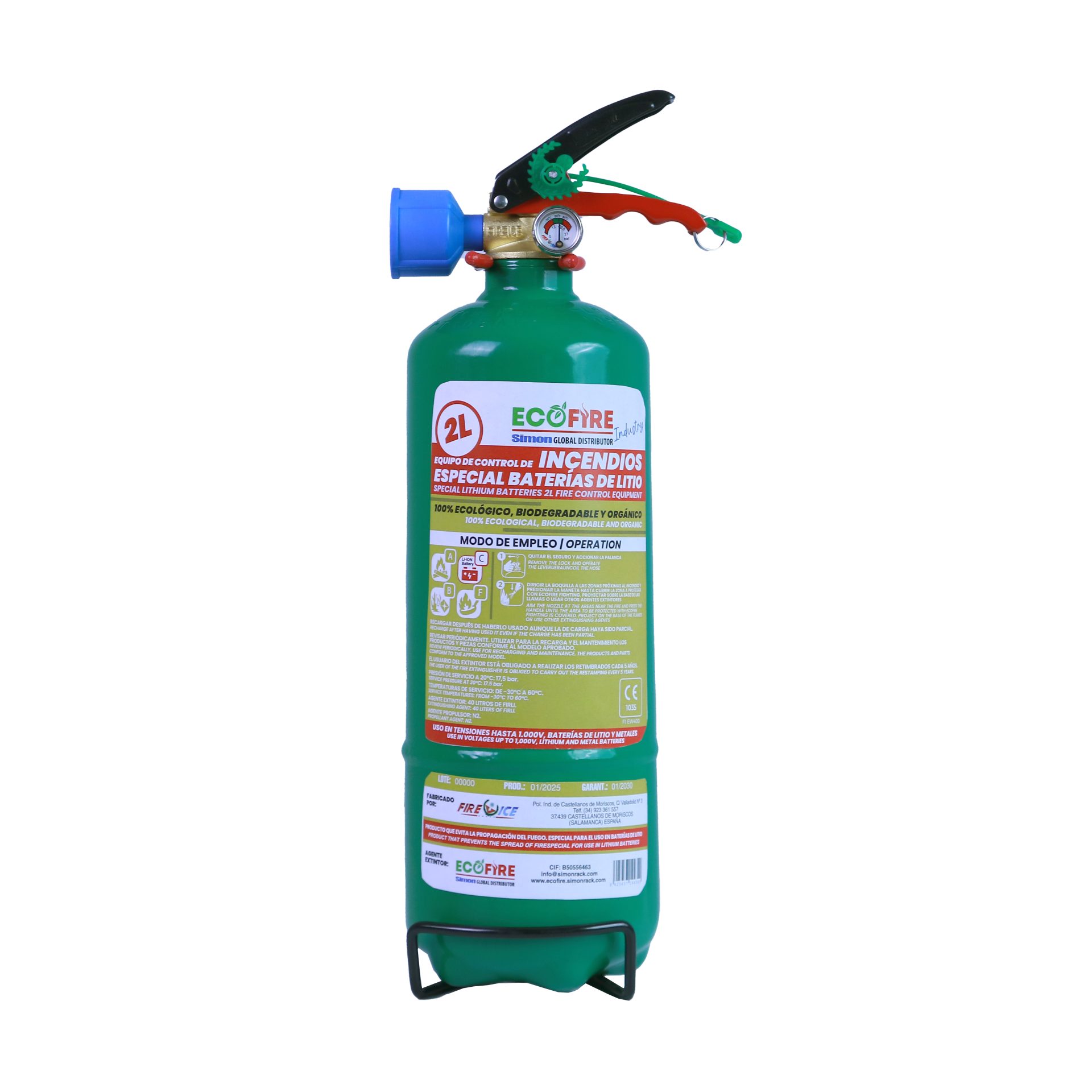 Certificado para la extinción de fuegos eléctricos y apto para baterías de litio. Dispone de ensayo certificado dieléctrico hasta 25.000 V.